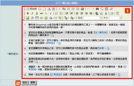 購物需知將會顯示於前台的「購物需知」中。提醒消費者購物時要注意的事項。